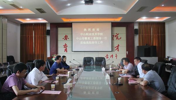 5月17日下午中山职业技术学院校长吴建新、中山市教育工委书记李长春一行5人前来我院进行考察交流。我院院长王聪田、副书记邬国盛等领导接待了来宾。