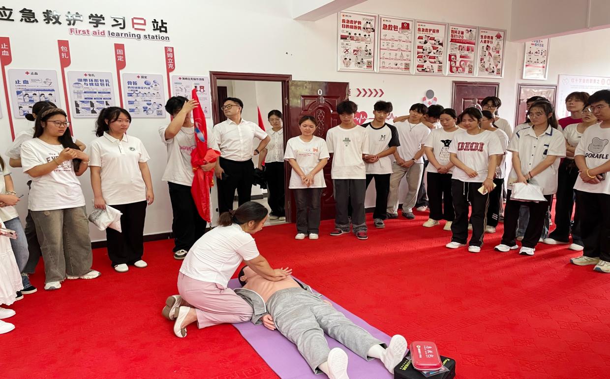 仪式结束后,校团委联合后勤保卫处组织开展“应急救护能力知识和技能培训”,通过普及心肺复苏(CPR)、自动体外除颤器(AED)的使用知识以及社会实践中常见的日常健康知识科普,为即将踏上实践征程的实践团保驾护航。