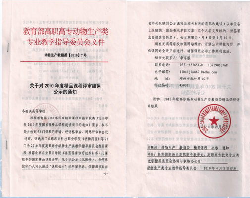 2010年,主持课题《动物寄生虫病防治技术》入选教育部国家精品课程